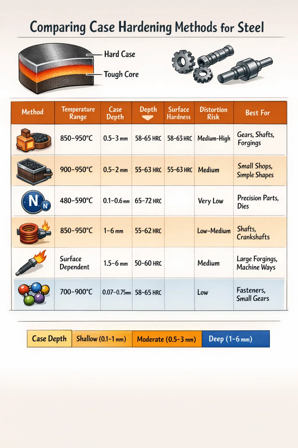 | phương pháp | Phạm vi nhiệt độ | Độ sâu trường hợp | Độ cứng bề mặt | Rủi ro biến dạng | Tốt nhất cho |