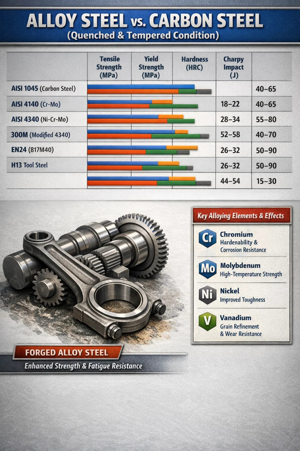Đặt độ bền của thép hợp kim trong bối cảnh so với các vật liệu kết cấu khác giúp giải thích lý do tại sao nó vẫn là lựa chọn chủ yếu trong các ứng dụng rèn đòi hỏi khắt khe mặc dù có sẵn hợp kim titan, hợp kim nhôm và vật liệu tổng hợp tiên tiến.