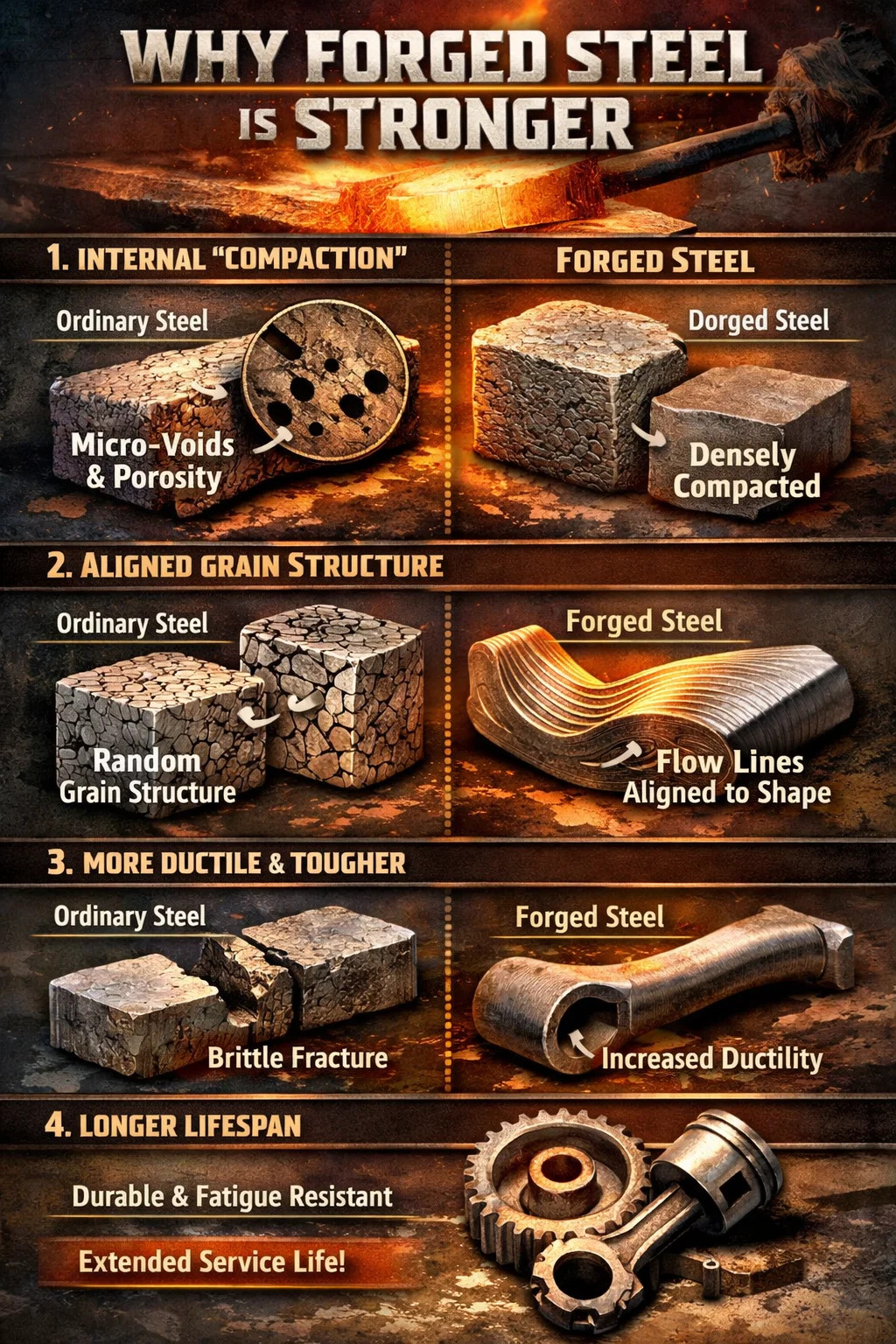Thép rèn thực sự mạnh hơn thép thông thường (chẳng hạn như nguyên liệu thô chưa qua chế biến hoặc thép đúc). “Sức mạnh” này không chỉ thể hiện ở độ cứng mà còn ở độ bền và độ tin cậy của nó.