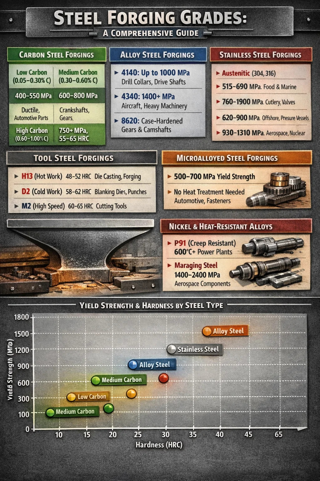 Rèn thép là một trong những quy trình gia công kim loại lâu đời nhất và đáng tin cậy nhất trong sản xuất. Câu trả lời ngắn gọn cho những loại thép rèn nào tồn tại: thép cacbon, thép hợp kim, thép không gỉ, thép công cụ và thép vi hợp kim là năm loại chính được sử dụng trong rèn thép công nghiệp. Mỗi loại phục vụ các nhu cầu cơ học và môi trường riêng biệt, và việc chọn sai loại có thể dẫn đến hỏng hóc sớm, nguy hiểm về an toàn hoặc chi phí vượt mức không cần thiết.