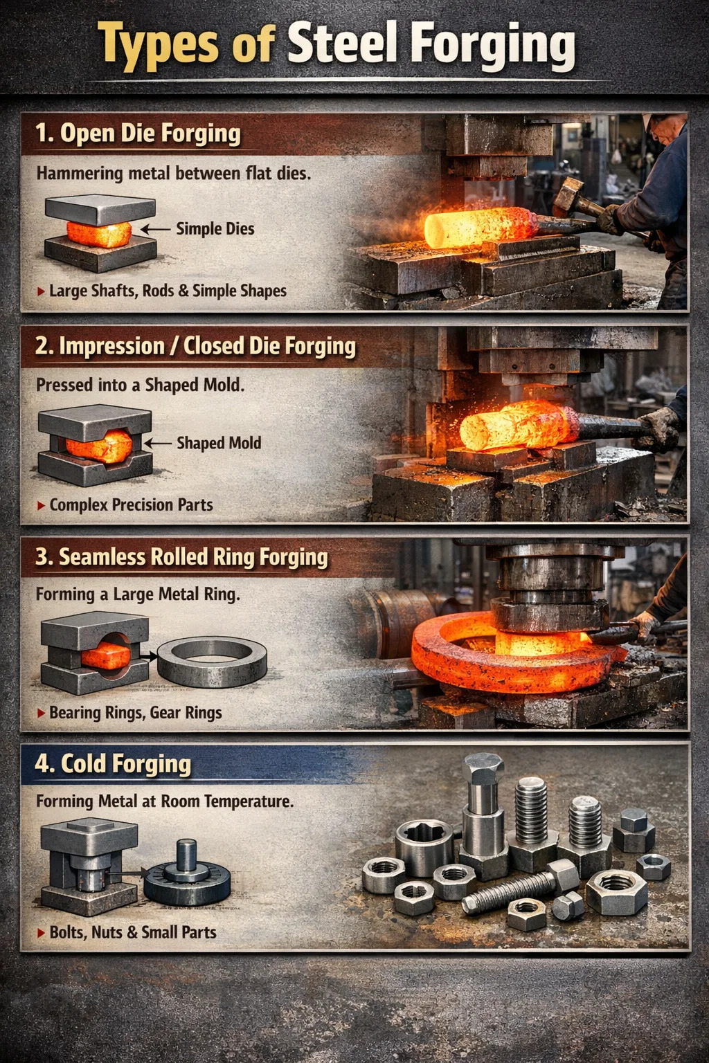Trong lĩnh vực gia công kim loại, có rất nhiều quy trình rèn khác nhau. Theo cách phân loại phổ biến nhất, rèn thép thường có thể được chia thành bốn loại sau: